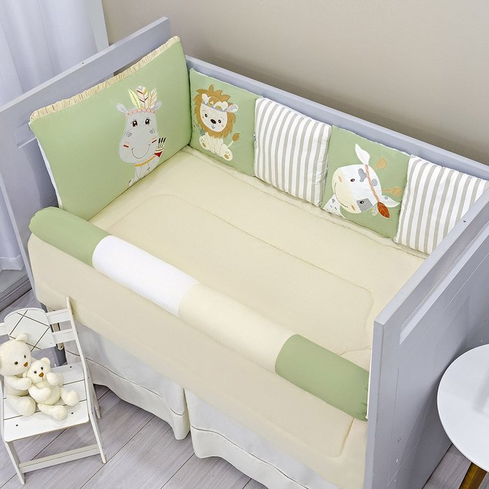 Kit de Berço Compose almofada 11 Peças 100% algodão. Para berço padrão americano e nacional. Esse kit protetor de berço, foi desenvolvido especialmente para dar segurança e conforto ao seu bebê. Os protetores de berço são os diferenciais desse conjunto: quatro almofadas que possibilita diversas composições, amarrados entre si e também no berço. As almofadas podem ser reutilizadas, depois como decoração em cima da cama montessoriano ou cama de solteiro.
