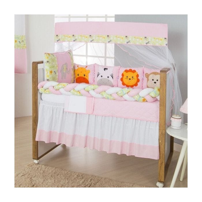 Kit Protetor De Berço Rosa Menina Savana Trança Com Saia.