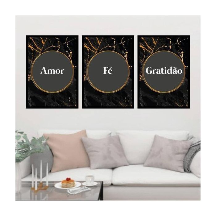 Kit Quadro Decorativo Amor, Fé, Gratidão 45x34cm 3 Peças