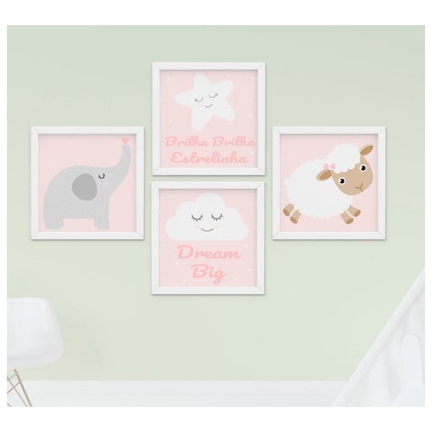 Kit Quadro Infantil Bebê Menina Ovelhinha Nuvem Estrela Elefantinho 4 Peças