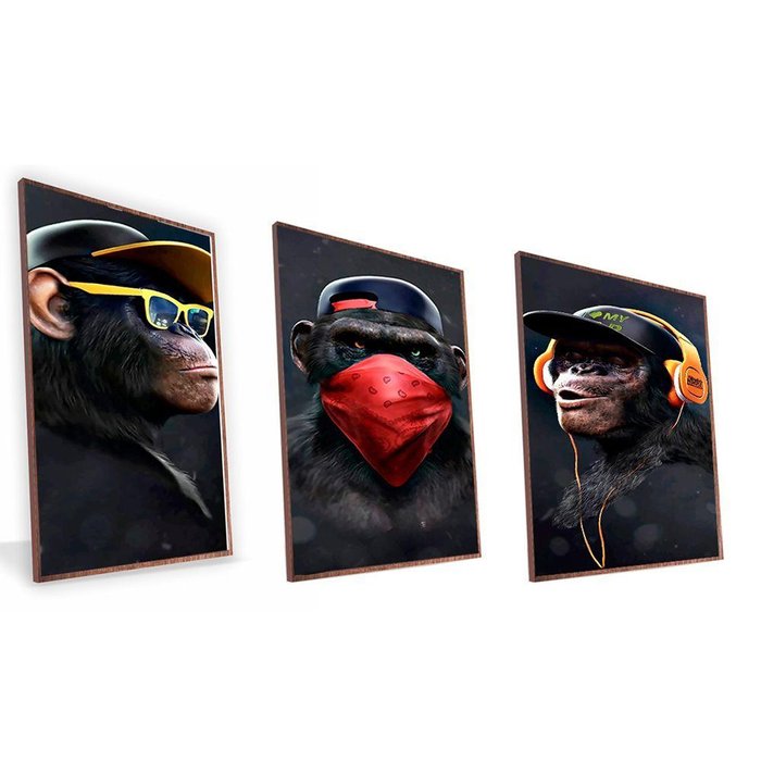 Kit Quadro Macacos Bandidos Canvas sem Vidro Tamanho-moldura 20x30 Baixa Cor Madeira