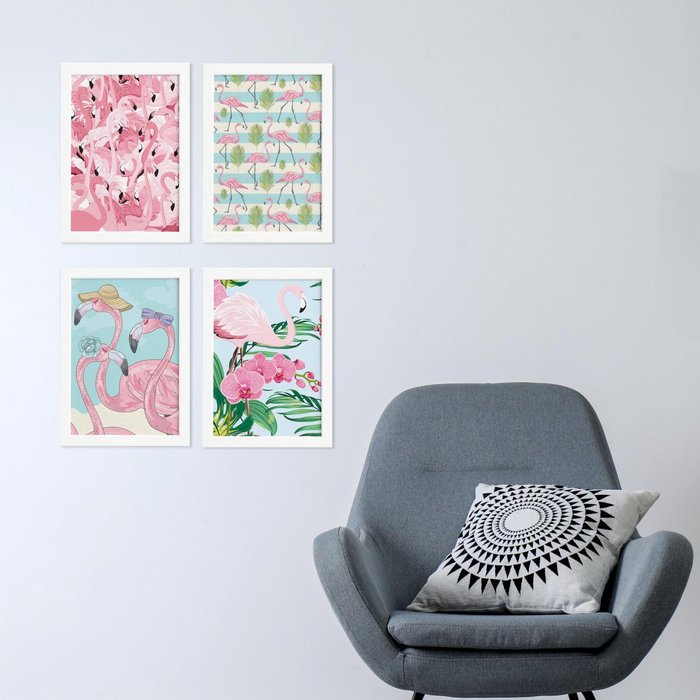 Kit Quadros Flamingos Tropicais Moldura Branca 4un 22x32cm