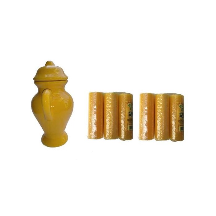 Kit vem com uma quartinha amarela e 6 velas 7 dias amarelas com mel.