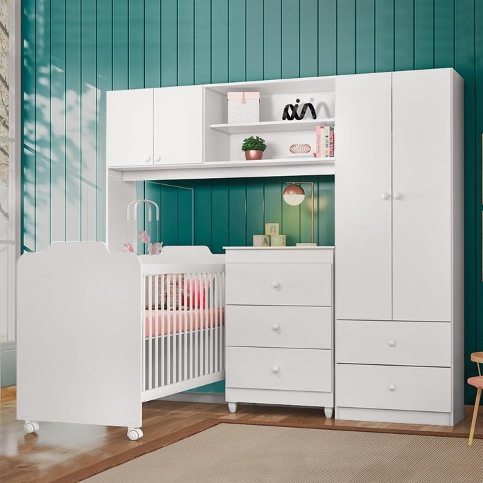 Dimensões do berço: Largura 68 cm; Profundidade 133,3 cm; Altura 96,8 cm.Dimensões do guarda-roupa: Largura 36,8 cm; Profundidade 200 cm; Altura 183,5 cm.Dimensões da cômoda: Largura 62 cm; Profundidade 38,3 cm; Altura 93 cm.Itens Inclusos: 1 berço, 1 guarda-roupa e 1 cômoda (não acompanha colchão)- Kit inclui 1 berço, 1 guarda roupa conjugado e 1 cômoda* Detalhes do berço *- 4 rodízios sendo 2 deles com travas- 2 regulagens de altura do estrado- Possui suporte para mosquiteiro- Pintura UV em alto brilho- Produzido em MDP (grades em madeira maciça para maior segurança)- Ideal para colchão 60 x 130 cm- Certificado pelo Inmetro*Não acompanha colchão* Detalhes do guarda roupa conjugado *- 4 portas com dobradiças metálicas- 2 gavetas com corrediças metálicas- 2 nichos organizadores- Pintura UV em alto brilho- Produzido em MDP- O espaço para berço é de 134 cm de profundidade- Montagem versátil (pode ser montado dos dois lados)- Produto compacto ideal para pequenos ambientes pois permite que o berço seja encaixado abaixo dele* Detalhes da cômoda *- 3 gavetas com corrediças metálicas- Pintura UV em alto brilho- Produzido em MDP- Sistema de cores Flex (na hora da montagem você pode optar por toda branca ou branca e rosê)- 4 pés em PVC- Puxadores redondos para garantir um design infantil e delicado Complexidade da montagem: Média, pode ser montado por mais de uma pessoa e/ou necessite de maior conhecimento para montagem.Recomendações de uso, manutenção e limpeza: Limpar com flanela ou pano macio seco, não utilizar produtos abrasivos, desengordurantes, álcool ou solvente. Não expor o produto diretamente a luz solar e à umidadeGarantia: 3 mesesOBS: Foto meramente ilustrativa, objetos, utensílios e decoração não fazem parte do produto.