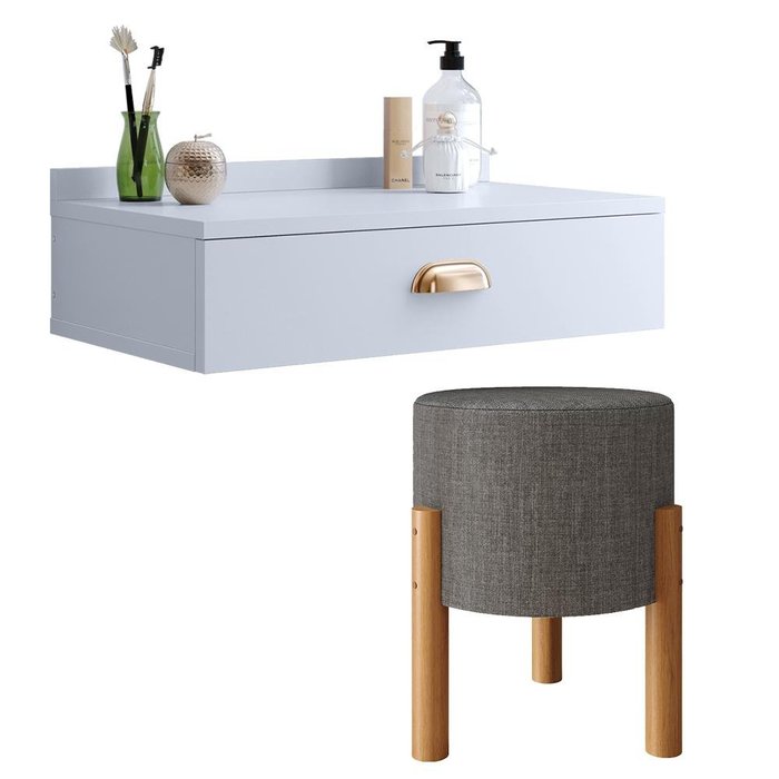 Kit Quarto Penteadeira Suspensa Gaveta Camarim Gloss Branco Puff Banco Banqueta Estofada Cinza - RPM