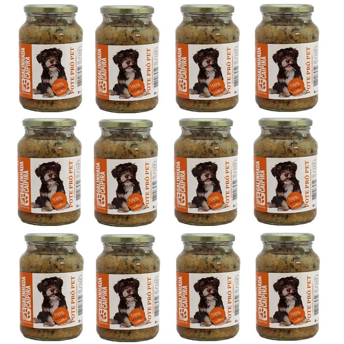 - Alimento natural para animais (cães) - Kit = 12 un pote de 535g - Versão: galinhada caipira - Peso líquido: 535g O alimento natural POTE PRÓ PET é diferente das rações convencionais. É comida de verdade, o que existe de mais saudável e prático para a nutrição de cães adultos. A receita do pote foi elaborada por veterinários e nutrólogos de instituição renomada para garantir o bem-estar do seu amigo. São utilizados alimentos frescos e selecionados, consumidos por humanos e cobiçados pelos cães. NÃO CONTÉM: milho, soja, trigo, conservantes, corantes, acidulantes, estabilizantes e sabores artificiais que podem fazer mal ao animal. O processo de cozimento garante esterilização total, inclusive contra o botulismo. Inspirado na papinha de bebê o produto vem pronto para servir e pode ser armazenado de forma simples em sua despensa. Ideal para quem quer proporcionar mais saúde para o seu cão de forma prática. - Dimensões da Embalagem: 9 x 14 x 9cm - Validade: 9 meses a partir da data de fabricação - Indicação de uso: indicado para cães adultos - Tipo de alimento: alimento úmido 100% natural (Original - Distribuidor autorizado) - Modo de consumo: pronto para servir. Não precisa descongelar, hidratar ou esquentar. Pode ser consumido sozinho sem necessidade de complemento ou misturado a ração seca. - Modo de conservação: Armazenar em local seco, fresco e ao abrigo da luz. Após aberto, conservar refrigerado até 9 graus Celsius (geladeria) por no máximo 3 dias. - Ingredientes: Água, coração de frango, batata doce, cenoura, arroz parboilizado, fígado de frango, ervilha, abóbora, folha de brócolis, óleo de canola, levedura de cerveja, semente de abóbora, alga nori, farinha de casca de ovo, fosfato bicálcio, sal light, magnésio quelado, ferro quelado, sulfato de zinco, iodo quelado, manganês quelado, cobre quelado, vitamina B1, vitamina B2, niacinamida, pantetonato de cálcio, vitamina B6, cloreto de colina, ácido fólico, vitamina B12, vitamina A, vitamina D3, vitamina E. - Produto original, lacrado e registrado pelo Ministério da Agricultura. Dúvidas Frequentes: - O que é o alimento natural POTE PRÓ PET? R. É um alimento úmido 100% natural que contém todos os ingredientes necessários para a dieta de cães adultos, sem a necessidade de suplementação. A receita balanceada foi elaborada por veterinários e nutrólogos, a produção é artesanal com ingredientes frescos e selecionados, pode-se oferecer o pote sozinho ou misturado com a ração seca o que facilita a digestão da mesma. - Por que devo oferecer POTE PRÓ PET ao meu cão? R. Evita problemas de pele, proporciona mais disposição e longevidade, fezes com menor volume e odor, protege os rins e sistema urinário,e contribui para o controle da obesidade. - Como devo usar o POTE PRÓ PET? R. O POTE PRÓ PET vem pronto para servir, basta abrir o pote e oferecer nas quantidades indicadas para o seu cão. Não há necessidade de descongelar, hidratar ou esquentar. - Qual a quantidade necessária para garantir a nutrição do meu cão? R. De acordo com o fabricante a quantidade recomendada pode alterar em função da atividade do seu cão. Para uma dieta exclusiva de POTE PRÓ PET, recomenda-se dividir a quantidade diária sugerida abaixo em 2 ou 3 refeições. Porte/Peso *Quantidade Miniatura - até 5kg *até 300g Pequeno - 5 a 10kg *200 - 600g Médio - 10 a 25kg *400 - 1250g Grande - 25 a 35kg *1000 - 1750g Gigante - > 35kg *4% do peso *Recomendações: cães não habituados à Alimentação Natural devem receber até 30% de POTE PRÓ PET no primeiro dia, até 60% no segundo e até 100% a partir do terceiro.