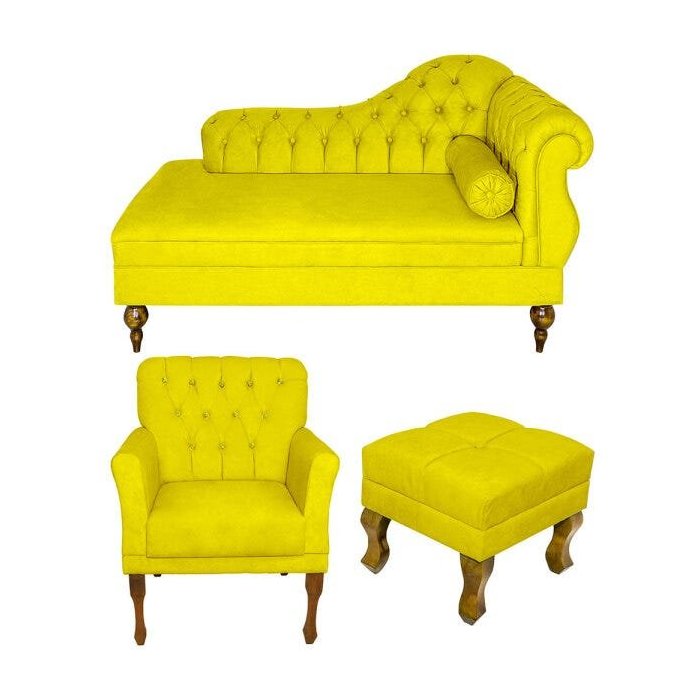 Kit Recamier Sofá Divã Cancun + Poltrona Bia + Puff Bia - Sued Amarelo