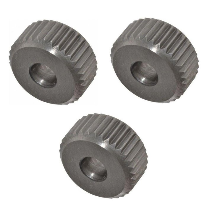 Kit Recartilha Reta 3/4 Passo 1,0 + 1,2 + 1,5 mm As Recartilhas são roletes de aço temperados, extremamente duros, que possuem uma série de dentes e estrias com funcionalidade de penetrar, mediante grande pressão, no material da peça. A superfície estriada resultante recebe o nome de recartilhado. ESPECIFICAÇÕES 1,0MM: - Diâmetro: 3/4";