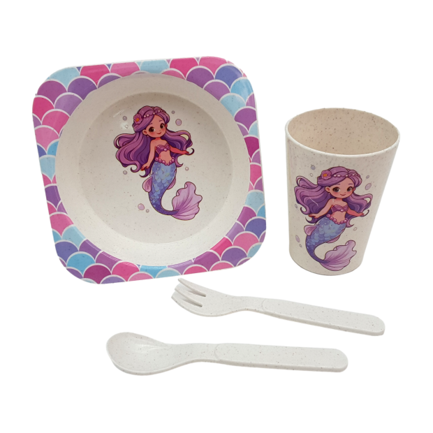 O conjunto inclui um prato, um copo e dois talheres. O copo e o prato são personalizados com motivos que atraem o público infantil.