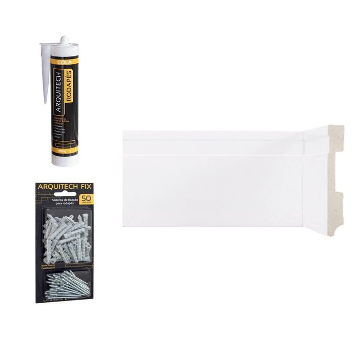 A instalação dos rodapés de poliestireno pode ser feita através de cola e/ou fixação por clippers.