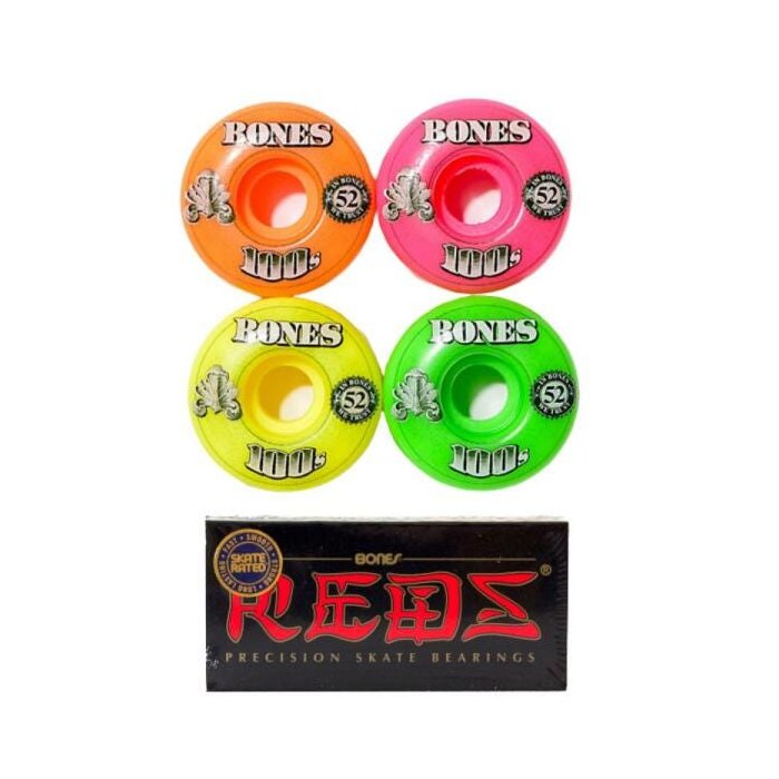 As Rodas Bones 100S Colors são produzidas em uretano, possuem tamanho 52mm e dureza 80B. Os Rolamento Bones Reds possuem diâmetro interno 8mm e diâmetro externo 22mm. Os produtos Bones Wheels são de fabricação própria e tecnologia desenvolvida exclusivamente para confecção de seus produtos. O que torna uma marca diferenciada no mercado.