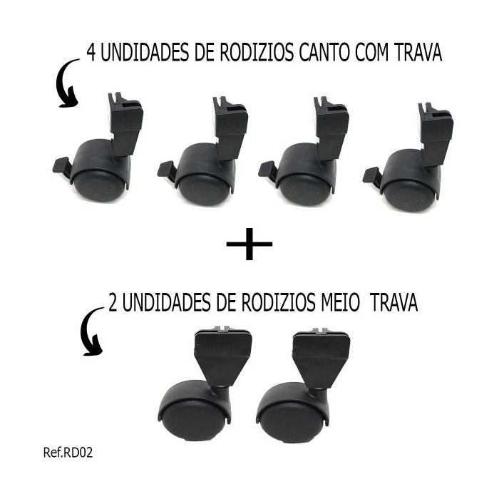 Kit contendo 2 rodízios de meio e 4 de canto - conectivos de canto acompanham trava que possibilitam uma maior segurança e estabilidade para o seu móvel- Ideal para você que deseja personalizar seu balcão.