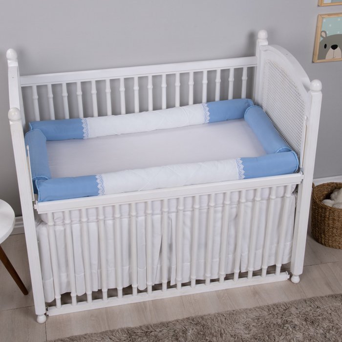 O Kit de Rolinhos de Berço é um kit clássico e atemporal para dar vida ao quartinho do seu bebê. O Kit de Rolinhos é o produto ideal indicado para o berço, pois protege de acidentes, e evita que o bebê bata a cabeça ou prenda as mãozinhas nas estruturas e aberturas do berço. Além de seguro, é uma excelente escolha para os papais, pois o produto dá um toque de delicadeza e conforto para o quartinho.Medidas Aproximadas (Largura X Altura):- 2. Rolinhos Maiores: 1,30 m (C) X 12 cm (A);- 2. Rolinhos Menores: 47 cm (C) X 12 cm (A).Material e Composição: - 100% Algodão; - Refil Siliconado Ultra Macio: 100% Poliéster;- Guipir.Informações Específicas:- Hipoalergênico/Antialérgico;- Capa Removível para facilitar a higienização;- Acolchoado;- Toque Macio;- Seguro;- Enchimento em refil para que possa remover e facilitar a higienização;- Acabamento em Guipir.