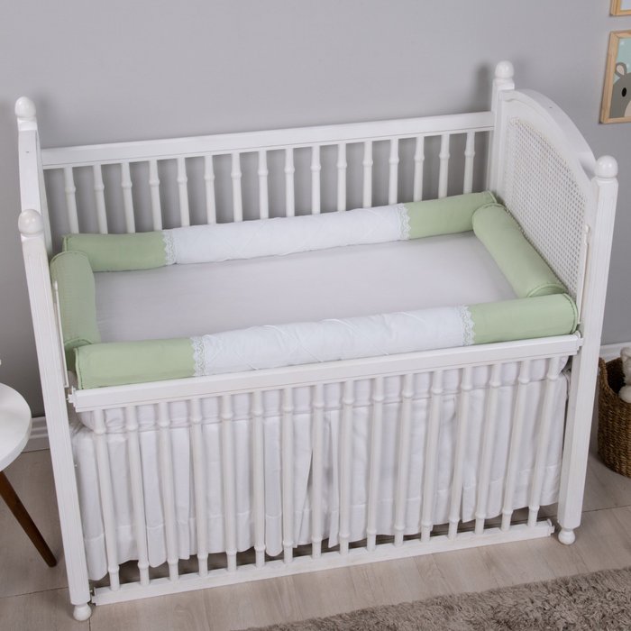 O Kit de Rolinhos de Berço é um kit clássico e atemporal para dar vida ao quartinho do seu bebê. O Kit de Rolinhos é o produto ideal indicado para o berço, pois protege de acidentes, e evita que o bebê bata a cabeça ou prenda as mãozinhas nas estruturas e aberturas do berço. Além de seguro, é uma excelente escolha para os papais, pois o produto dá um toque de delicadeza e conforto para o quartinho.Medidas Aproximadas (Largura X Altura):- 2. Rolinhos Maiores: 1,30 m (C) X 12 cm (A);- 2. Rolinhos Menores: 47 cm (C) X 12 cm (A).Material e Composição: - 100% Algodão; - Refil Siliconado Ultra Macio: 100% Poliéster;- Guipir.Informações Específicas:- Hipoalergênico/Antialérgico;- Capa Removível para facilitar a higienização;- Acolchoado;- Toque Macio;- Seguro;- Enchimento em refil para que possa remover e facilitar a higienização;- Acabamento em Guipir.