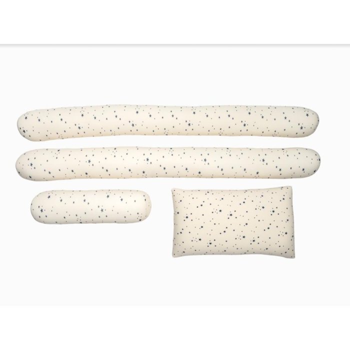 O kit berço composto de 4 peças, é ideal para proteger o berço do bebe com diferentes cores e estampas compõe perfeitamente com a decoração do quarto.. São dois rolos para as laterais maiores pesando 0,450kg cada, um rolo menor para a parte inferior do berço pesando 0,200kg, e um travesseiro que tambem pode ser usado como decoração ou de forma funcional pela familia toda.. As peças possuem exclusivo enchimento FOM que proporciona conforto para o bebe.. Indicado para berço padrão americano