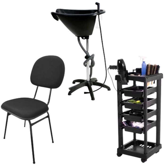 Kit Salão Preto Carrinho + Lavatório Cabeleireira + Cadeira
