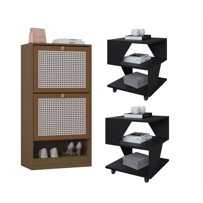 Kit Sapateira Spin Tropical 2 Portas e 2 Mesas de Cabeceira/centro Carvalho e Preto Poquema