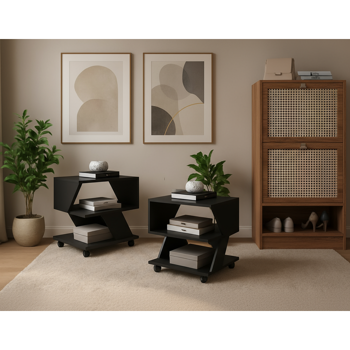 Kit Sapateira Spin Tropical 2 Portas e 2 Mesas de Cabeceira/centro Poquema Preto/Carvalho