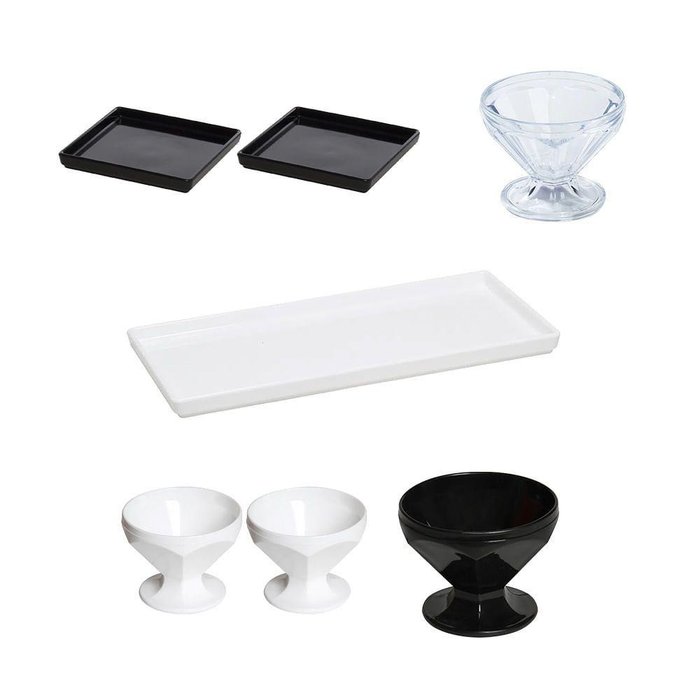 Kit Sobremesa - VemO kit é composto por:- 2 Prato Square Quadrado 13,5x13,5 Preto em Polipropileno Linha Tropical VEM- 1 Prato Square Retangular 13,5x27 Branco em Policarbonato Linha Profissional Cook VEM- 2 Taça Caribe de Sobremesa 150ml Branca em Polipropileno Linha Tropical VEM- 1 Taça Caribe de Sobremesa 150ml Preta em Polipropileno Linha Tropical VEM- 1 Taça Paris de Sobremesa 150ml Natural em Policarbonato Linha Profissional Cook VEM