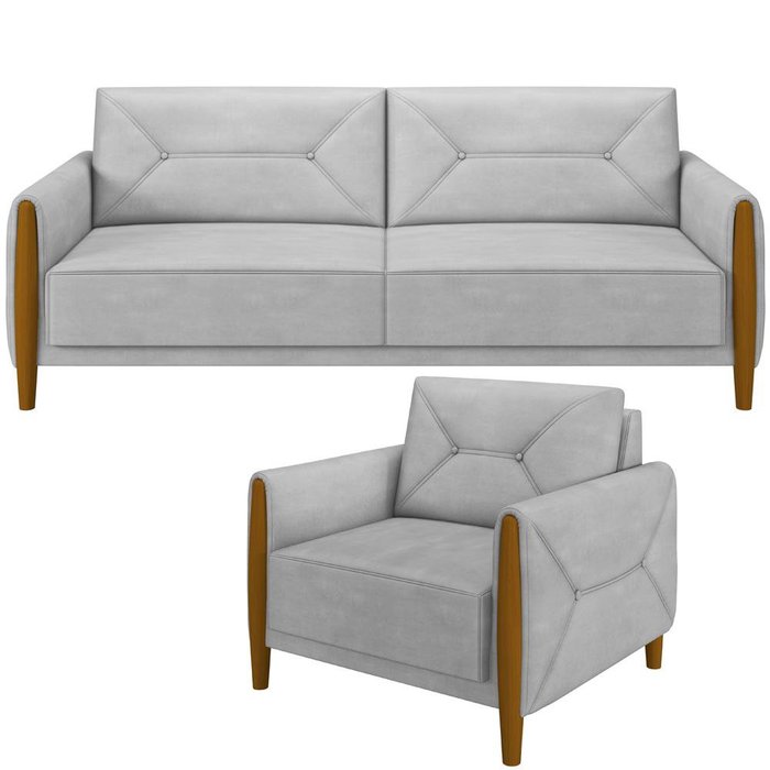 Kit Sofá 03 Lugares Sala Estar 220cm Com Poltrona Berilo Pés De Madeira M03 Veludo Cinza - Lyam cinza