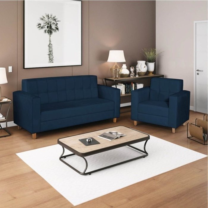 Kit Sofá 180cm e Poltrona em Suede Dallas Azul Marinho