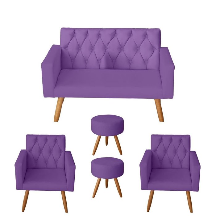 Kit Sofá 2 Lugares e 2 Poltrona Para Sala Bianca Capitonê e 2 Puff Redondo Suede Roxo - Móveis