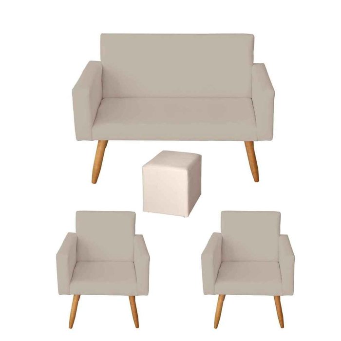 Kit Sofá 2 Lugares e 2 Poltrona para Sala Lina e 1 Puff Quadrado Suede Bege - Móveis Mafer