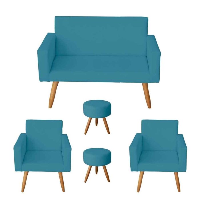 Kit Sofá 2 Lugares e 2 Poltrona Para Sala Lina e 2 Puff Sófia Suede Azul Turquesa - Móveis Mafer Azul Turquesa