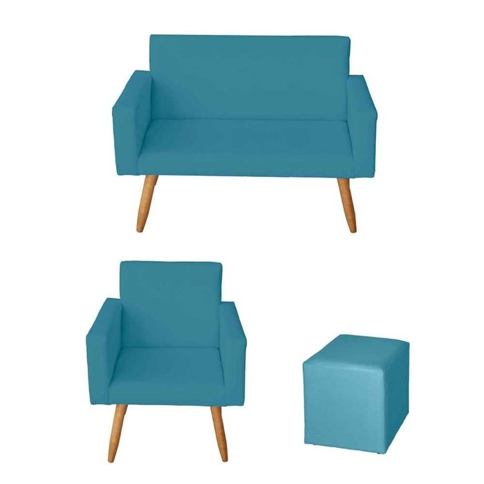 Kit Sofá 2 Lugares e Poltrona para Sala Lina e 1 Puff Quadrado Suede Azul Turquesa - Móveis Mafer