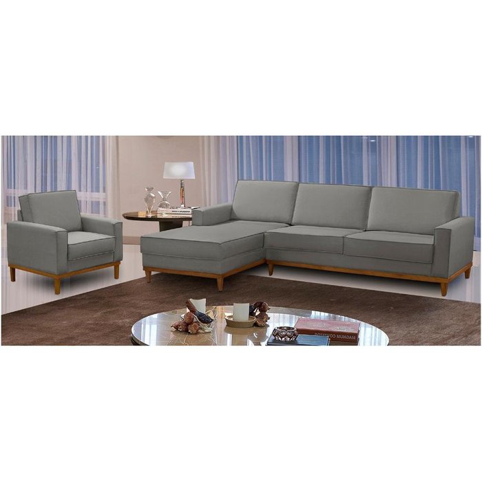 Kit Sofá 3 Lugares 2,10m com Chaise Esquerdo e Poltrona Living Lavinia Linho Cinza Adonai