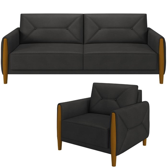 O Kit de sofá com poltrona Berilo promete marcar com elegância e versatilidade á presença em diversos estilos de decoração. O modelo certo é essencial para o bom funcionamento dos cômodos da casa, por isso, um sofá bem estruturado é mais do que necessário na sala de estar! O design aconchegante se destaca junto aos pés madeirados e o revestimento em couríssimo! Extremamente elegante, que transmite a nobreza que ele precisa! Tudo isso para gerar conforto para você e sua família em uma peça única feita com todo cuidado e observada nos detalhes para superar as suas expectativas! Adquira o seu! Dimensões do Sofá (L x A x P) 220 x 90 x 90 cm Dimensões da Poltrona (L x A x P) 95 x 90 x 90 cm Características: Estrutura em madeira de reflorestamento, imunizada contra mofo. Revestimento em Couríssimo na cor Preto. Sustentação do assento com cintas elásticas de alta resistência. Encosto fixo com fibras, flocos, revestida com kami e manta acrílica, assento com espuma D-26. Suporta até 120 kg por assento. Tela de ráfia. Pés em Madeira Tingidos. - Por se tratar de estofado as medidas podem ter uma pequena variação de até 3 cm. - A tonalidade do produto real poderá ter ligeira variação devido o lote de tecidos. Produto entregue montado. Indicado para uso residencial, sua limpeza deve ser feita com pano umedecido em água limpa, sem esfregar, não utilizar produtos abrasivos, desengordurantes, álcool ou solvente. Nunca sentar nos braços ou encosto do produto. Manter em lugar livre de umidade e/ou exposição direta ao sol. Observações importantes: - Produto para uso residencial em ambiente interno, não devendo ficar exposto diretamente ao sol, calor e umidade excessivos. - Pode haver alguma diferença de tonalidade entre a imagem e o produto real, por conta do tratamento de imagens e a calibração de cores do seu monitor. - As imagens são meramente ilustrativas, não acompanham objetos de decoração e eletrônicos. - Ao receber a mercadoria, o cliente deve verificar as condições da embalagem, caso haja alguma avaria não assine o comprovante de recebimento. - Montagem, desmontagem e outras instalações serão de responsabilidade do cliente. Não nos responsabilizamos, no ato da entrega, por subir escadas/elevadores ou pelo transporte por guincho em apartamentos. Eventuais despesas são de responsabilidade do comprador. - Confira as dimensões do produto e certifique-se de que passará normalmente por supostos elevadores, portas, escadas e/ou corredores de sua residência.