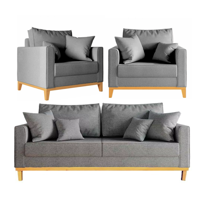 Kit Sofá Beny 180cm + 2 Poltronas Base de Madeira Linho Cinza