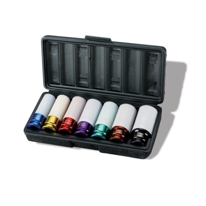 Kit de 7 soquetes de impacto sextavados em aço cromo-molibidênio com encaixe quadrado de 1/2 polegadas, ideal para utilização em rodas de liga - leve, pois com sua camada protetora em nylon não danificarão as rodas do veículo. Encaixe Quadrado 1/2 polegadas. Medidas (mm) 17, 19, 21, 22, 23, 24 e 27.