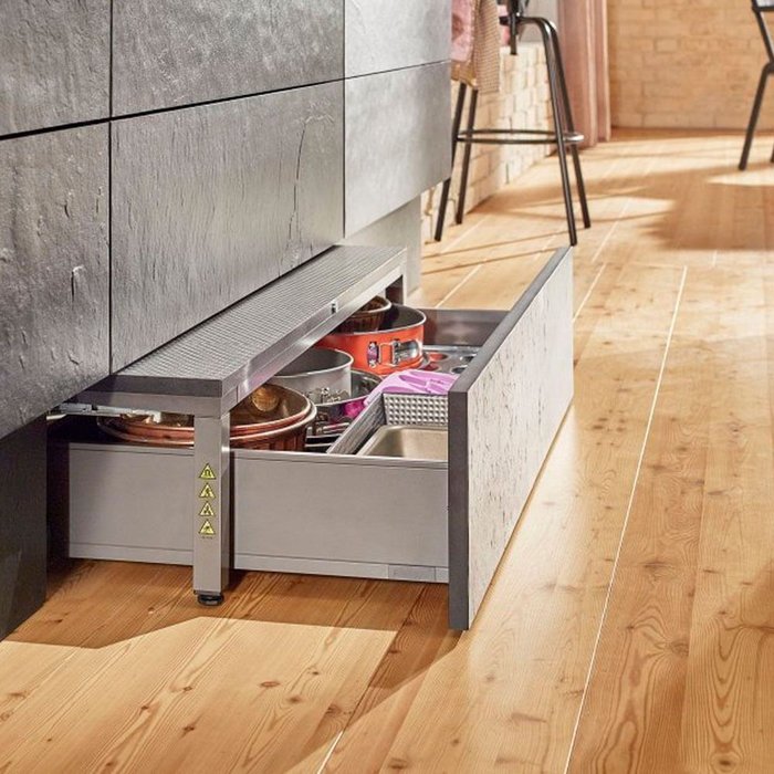 O Kit Space Step Z95.4600 da Blum, com 460mm e acabamento em cinza orion escovado, é uma solução inovadora que transforma o rodapé dos móveis em um degrau funcional e ainda cria espaço de armazenamento adicional. Este sistema inteligente permite alcançar armários mais altos com segurança e facilidade, além de otimizar o aproveitamento de cada centímetro do ambiente, sendo ideal para cozinhas, banheiros e closets. Compatível com guias de 500mm, o Kit Space Step é fabricado em nylon e aço, garantindo durabilidade e suportando o uso diário. Ele pode ser combinado com as tecnologias de movimento da Blum, como BLUMOTION para fechamento suave e silencioso, e SERVO-DRIVE para abertura elétrica, proporcionando máximo conforto e praticidade. O sistema também conta com um mecanismo de travamento antiderrapante que é ativado com apenas 8kg de peso, assegurando a segurança do usuário.