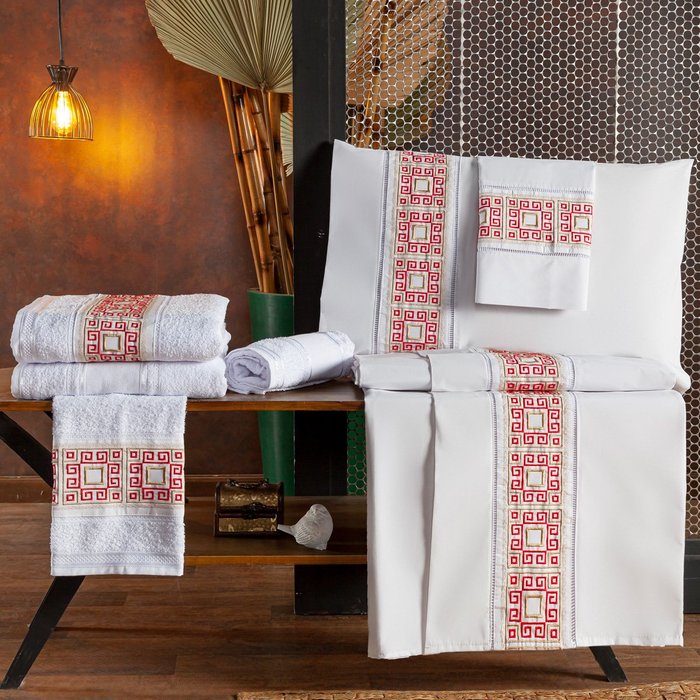Kit Suite Casal Padrão Grécia Bordado Jogo de Cama Banho:Branco/Vermelho