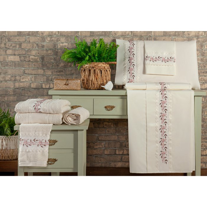 O Kit Suite Leaves 8 peças resgata a tradição dos antigos lençóis detalhados e cheios de bordado. Pronto para decorar seu quarto com requinte e sofisticação, a Coleção Leaves é desenvolvida em tecido Percal 180 Fios 80/20 e possui um bordado com detalhes em ramos florais, perfeito para quem busca uma decoração harmoniosa e clássica. O conjunto é composto pelo lençol de cima com bordado, lençol de baixo com elástico em toda a volta e duas fronhas bordadas. O Banho Leaves é desenvolvido com tecido felpudo 100% algodão e acompanha os desenhos do jogo de cama, sendo uma toalha de banho bordada e outra sem bordado, e uma toalha de rosto bordada e outra sem bordado. Conteúdo da embalagem: 1 Lençol de cima 2,40m x 2,20m 1 Lençol de baixo com elástico 1,88m x 1,48m x 30cm altura 2 Fronhas 70cm x 50cm 01 Toalha de banho bordada 1,35m x 70cm 01 Toalha de banho simples 1,35m x 70cm 01 Toalha de rosto bordada 70cm x 45cm 01 Toalha de rosto simples 70cm x 45cm. Composição do Jogo de Cama: Tecido: 80% Algodão / 20% Poliéster. Composição do Jogo de Banho: Tecido: 100% Algodão.