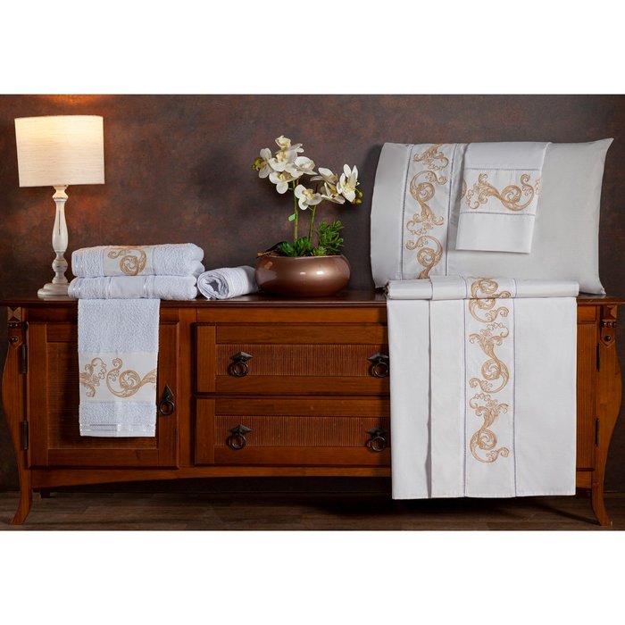 Kit Suite King Size Arabesco Bordado Jogo de Cama Banho:Branco/Dourado Branco/Dourado