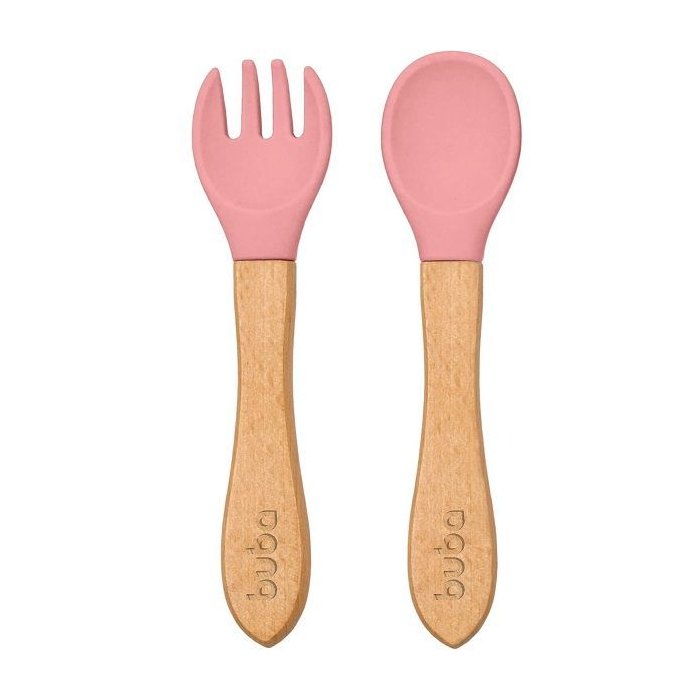 Kit Talher de Silicone e Bambu Garfo Colher de Bebe Buba Rosa Rosa