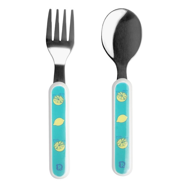 Kit talher Limão Verde Pimpolho ideal para incentivar a criança à ter autonomia na hora das refeições, possui garfo e colher produzidos com lâminas de aço inox e cabos de polipropileno, com tamanho ideal para as mãozinhas do bebê.