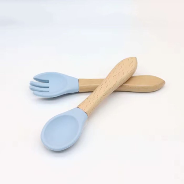 Kit Talheres Bambu Silicone Colher + Garfo Refeição Bebê Azul