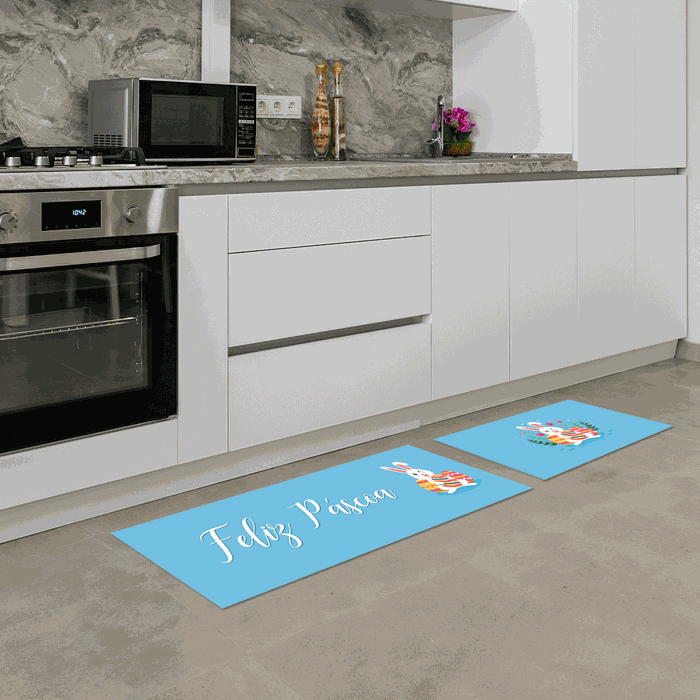 Kit Tapete de Cozinha 2 peças Feliz Páscoa Fundo Azul -