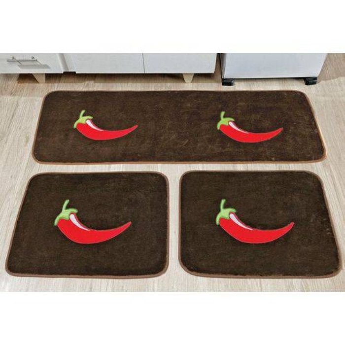 Kit Tapetes de Cozinha Bordado Antiderrapante Pimenta 3 Peças - Tabaco