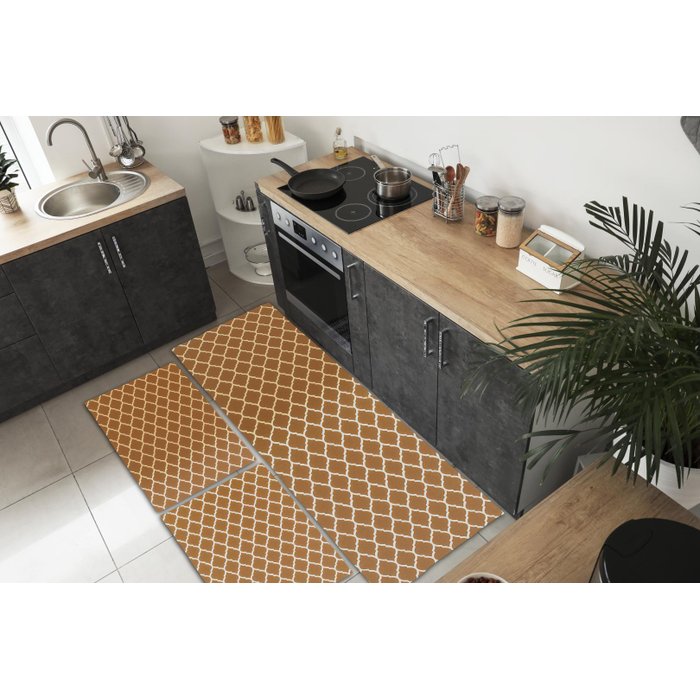 Kit Tapetes e Passadeira De Cozinha 3 Peças Antiderrapante Arabesco Geométrico Caramelo e Cru