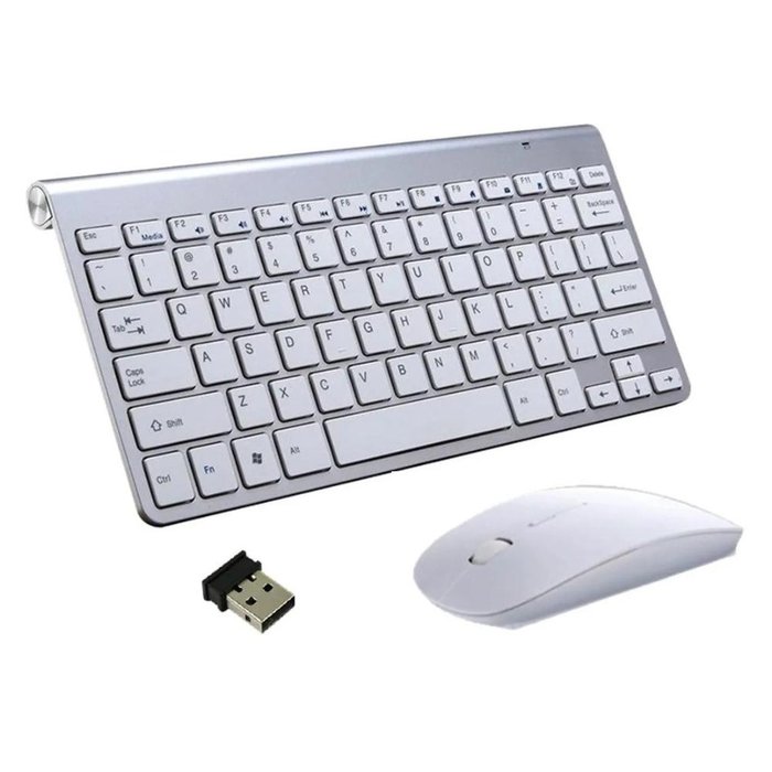 Características: Kit teclado e mouse sem fio ultra-fino elegantes, confortável, toque macio, operação suave. Permite-lhe operar cada tecla leve e fácil. Plug and play Receptor nano, plug and play 2.4GHz distância operação técnica de até 10 metros chave inteligente, pronto para desligar completamente o poder o sono profundo automático para economizar energia design ergonômico Performance Frequência 2402MHz-2480MHz As frequências do grupo de trabalho 32, frequência automática de salto de trabalho tensão nominal 1.5V, Corrente nominal 5 mA, Sistema de rastreamento Optical De aceleração máxima 14 polegadas / seg. O uso de tecnologia avançada sem fio 2.4G, o que lhe permite mover-se livremente Baixa luz indicadora de bateria, luz vermelha pisca quando a vida útil da bateria fraca alerta Sem fio Frequência portadora 2402MHz-2480MHz Sem fio Canal de Trabalho 32, automática de frequência, faixa de recepção de rádio: 10 metros Respingo líquido O uso de sistema de gestão inteligente de bateria, teclado, Design de interface slim, mais perfeito para o seu espaço de trabalho. Cor: Prata com Branco Dimensões Teclado 280x112x20mm peso 302G Dimensões mouse 92x57x31mm peso 42G
