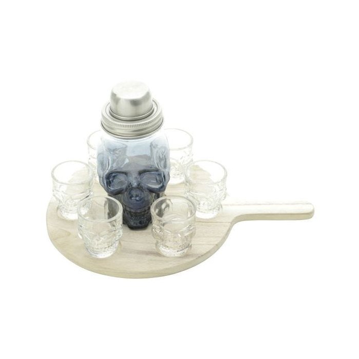 Kit Tequila Caveira 6 Copos Dose Coqueteleira e Tábua Madeira