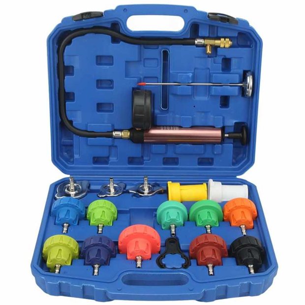 O Kit Teste de Arrefecimento com 18 Peças Lorben é indicado para diagnosticar problemas no sistema de arrefecimento do motor de um veículo, auxiliando na detecção de possíveis vazamentos de mangueiras, abraçadeiras, selos, etc.