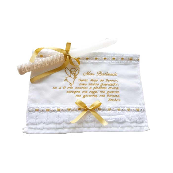Kit Toalha Batizado Bordada com Oração de Anjo da Guarda + Vela Decorada