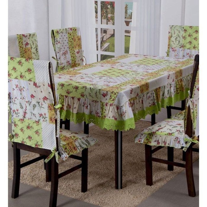 Kit Toalha de Mesa Retangular Melissa Com Capas de Cadeira 07 peças Toalha de Mesa estampada com babados e lasie Capa de cadeira estampadas com babados e lindos laços para amarrar Deixe a hora de suas refeições ainda mais bonitas e charmosa Contém na embalagem: 01 Toalha de Mesa 2,10m x 1,40m 06 Capas de cadeira (composta cada uma por: 01 Assento 0,80cm x 0,50cm + 01 Encosto 1,00m x 0,40cm) Composição: 50% Algodão / 50% Poliéster
