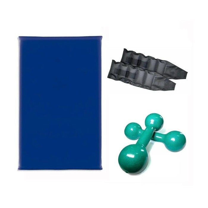 KIT DE GINÁSTICA PARA TREINAR EM CASA Para você usar em casa e manter suas atividades em dia. O kit é composto por 3 itens muito conhecidos e práticos, que podem ativar vários grupos musculares, através de uma infinidade de exercícios e também podem ser armazenados em pequenos espaços. Veja abaixo os itens do kit: PAR DE CANELEIRAS: A caneleira é ideal para a prática de exercícios físicos utilizada para fortalecer os músculos do quadril, joelhos, pernas, tornozelos, fisioterapia e prática de esportes, melhorando assim o condicionamento físico. Ela também pode ser usada para fisioterapia Especificações: Confeccionada em poliéster Fechamento com viés e costuras reforçadas; Enchimento com grãos de ferro. Fechamento com Velcro Peso: 3 Kg Contém: 1 Par PAR DE HALTERES Populares em academias para musculação e outros exercícios físicos os halteres são peças que auxiliam muito em treinamentos de diversas modalidades e os exercícios podem ser realizados em academia ou em casa. Especificações do produto: Fabricado em Ferro Fundido; Revestimento em PVC; Aferição do peso para mais ou menos: 5%; Peso: 3 Kg; Cor: Verde. COLCHONETE: Colchonete compacto para diversos exercícios, pilates e yoga Confortável e resistente Material: Espuma revestida em bagum Peso Líquido Aproximado: 550 G Dimensões (CxLxA): 90x40x3cm Cor: Azul