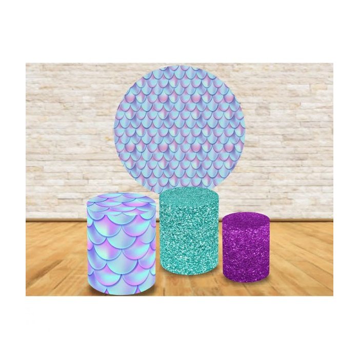Kit Trio Capa Cilíndrica + Painel Redondo Fundo do Mar Sereia Glitter